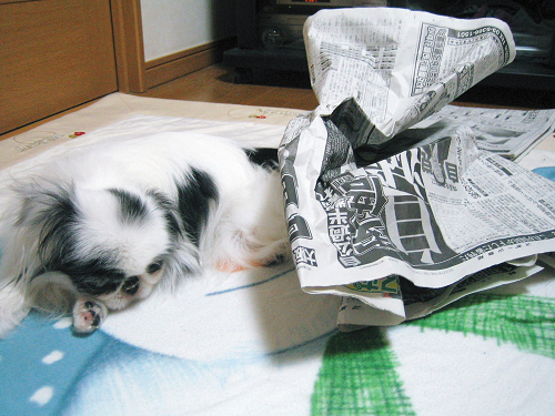 散々新聞紙蹴散らかしたあとは、マイベッド(簡易階段ベッド)にてぐっすりお休みになられました。